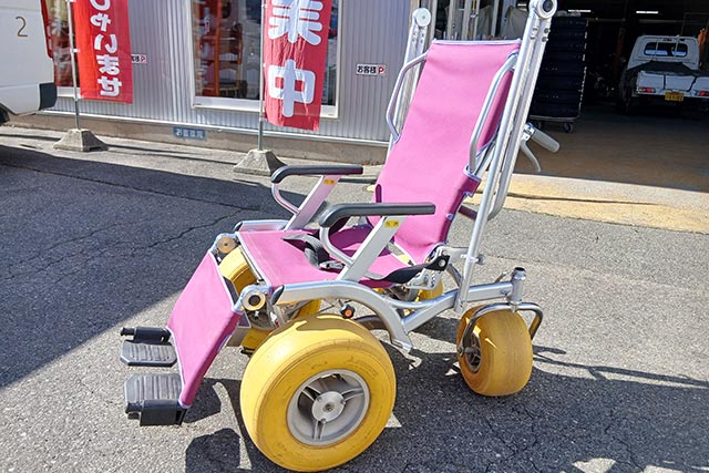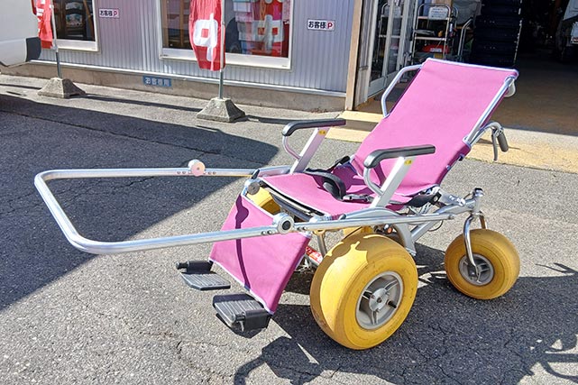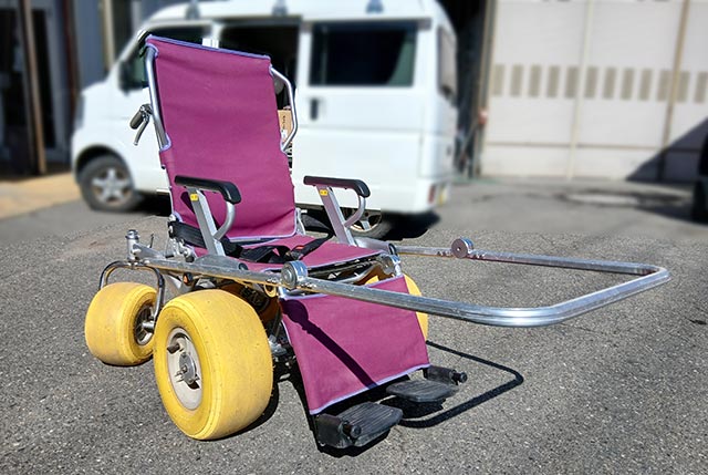- 超低圧ワイドタイヤを装着することにより、砂浜、川原、雪道、砂利道、農地など、 今までの車椅子では入れなかった場所にも気軽に行けます。