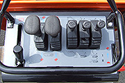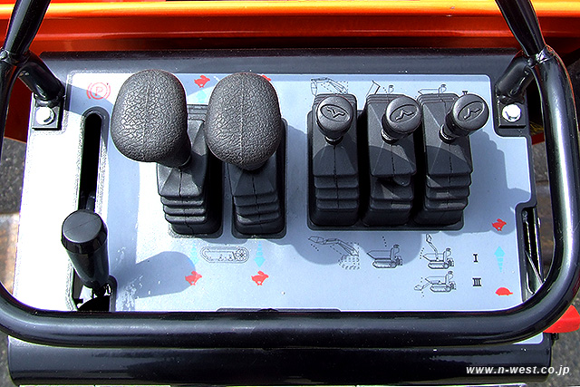 コルミディ社のユニークな 単純, 安全,簡単な5本の操作レバーがあり,左2 本は左右の走行レバー手のひらに収めて操作します。その右隣は増速2スピードレバー、ハイダンプレバー、荷台ダンプレバーです。機械式・セミHST タイプの機械とは異なりミッション・クラッチ、ケーブル、ベルトなどは一切ありません。