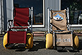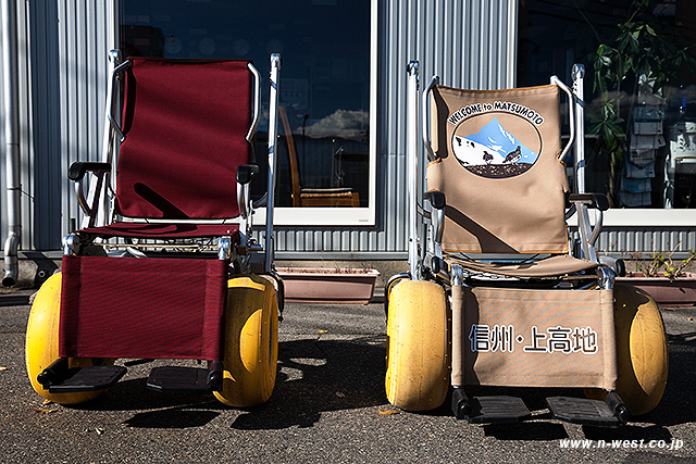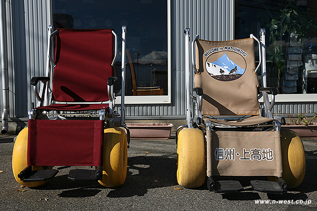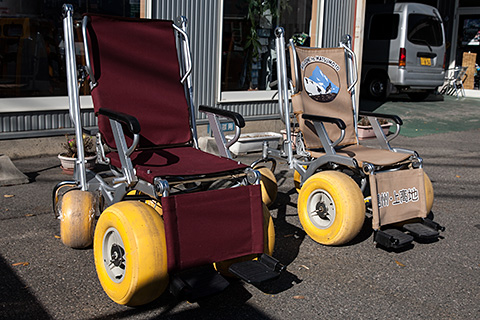 オフロード 不整地車いす"ジャリスター"には、通常の"ジャリスター"(写真右)と、"ジャリスター Sタイプ"(写真左)があります。