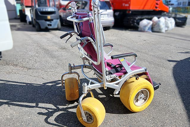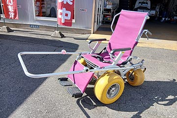 - 超低圧ワイドタイヤを装着することにより、砂浜、川原、雪道、砂利道、農地など、 今までの車椅子では入れなかった場所にも気軽に行けます。